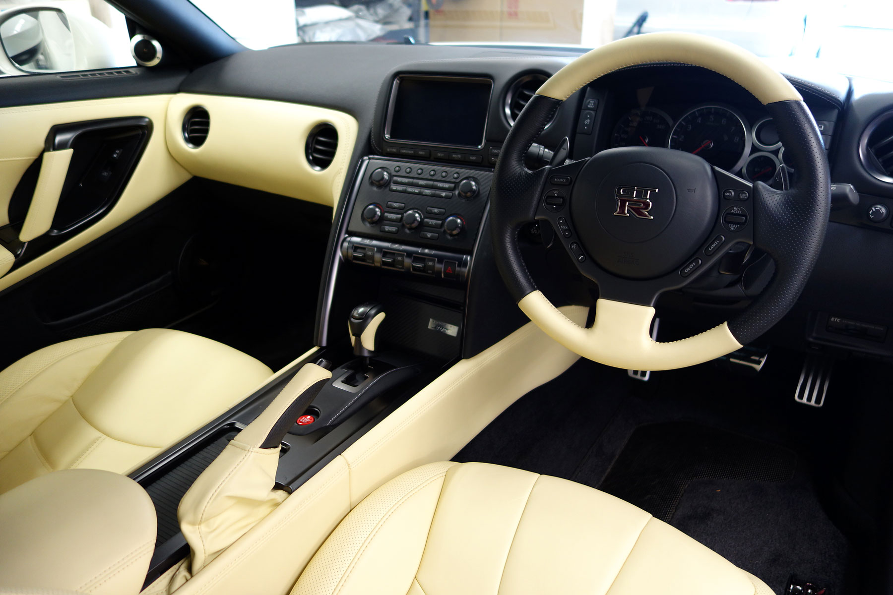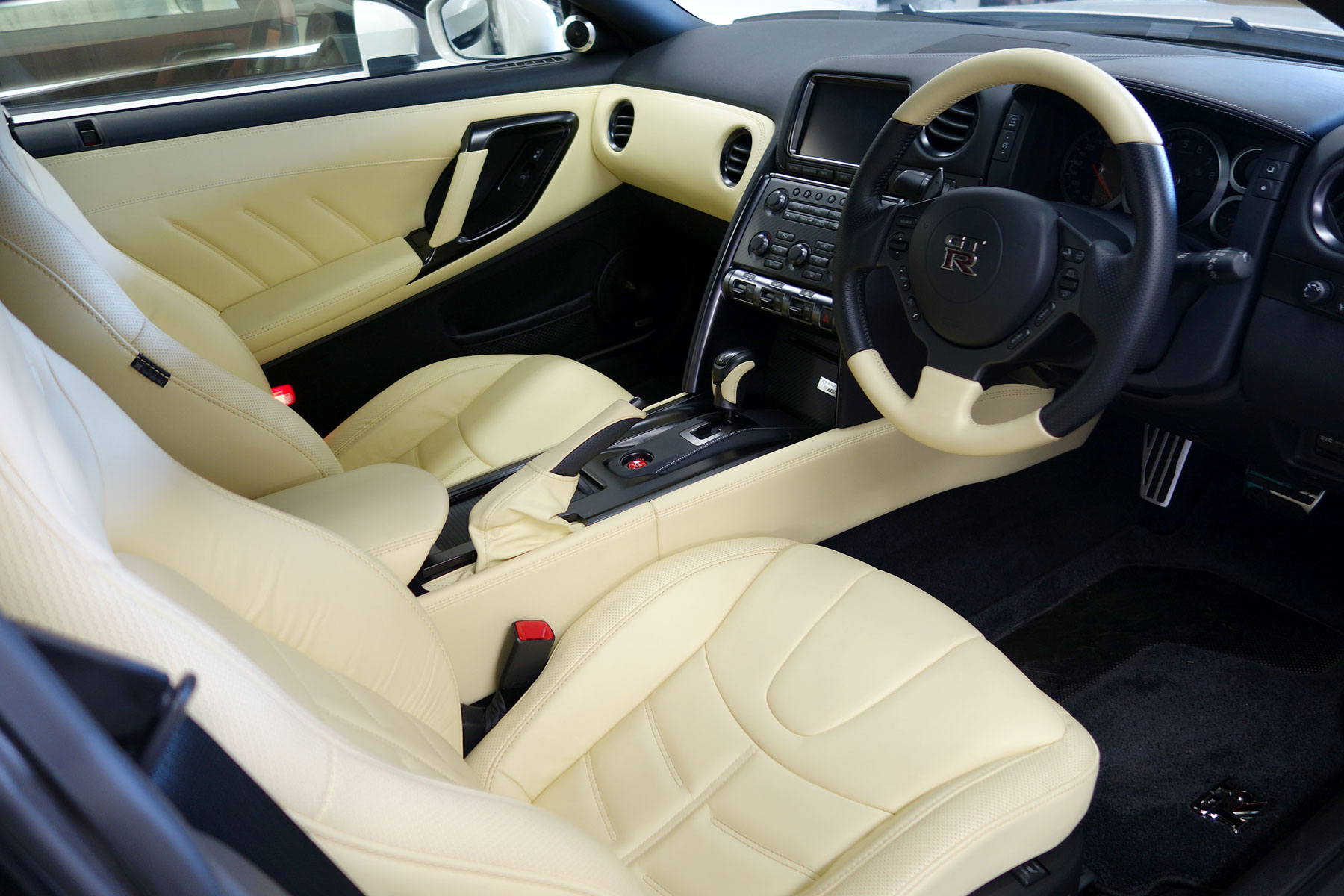 買取りした2014年モデルのR35GT-Rプレミアムエディションが入庫いたしました。メーカーオプションのファッショナブルインテリアに、標準装備のサッチャム防盗システム&BOSEサウンドシステム、純正HDDナビ&フルセグTV&TVナビキャンセラー、ビルトインETCを装備しています。
