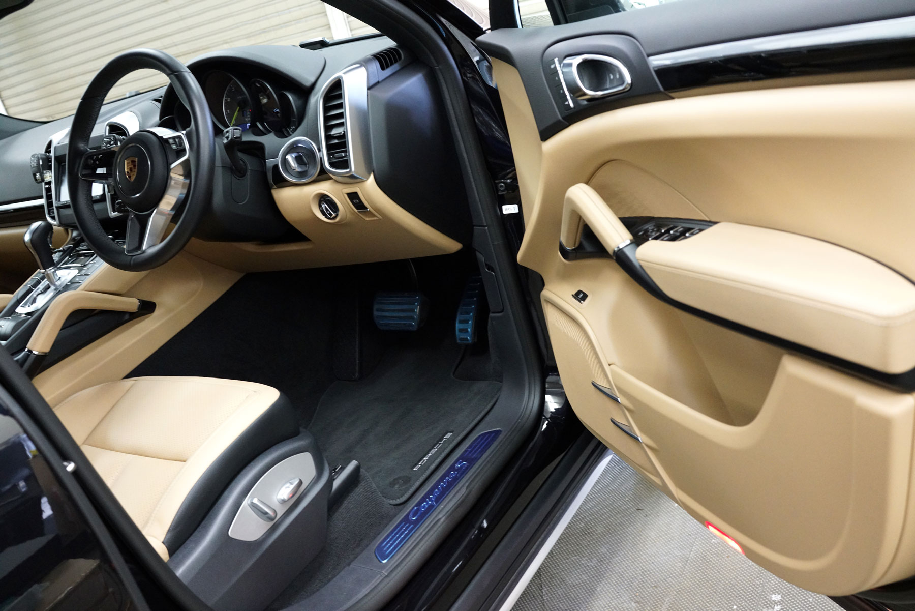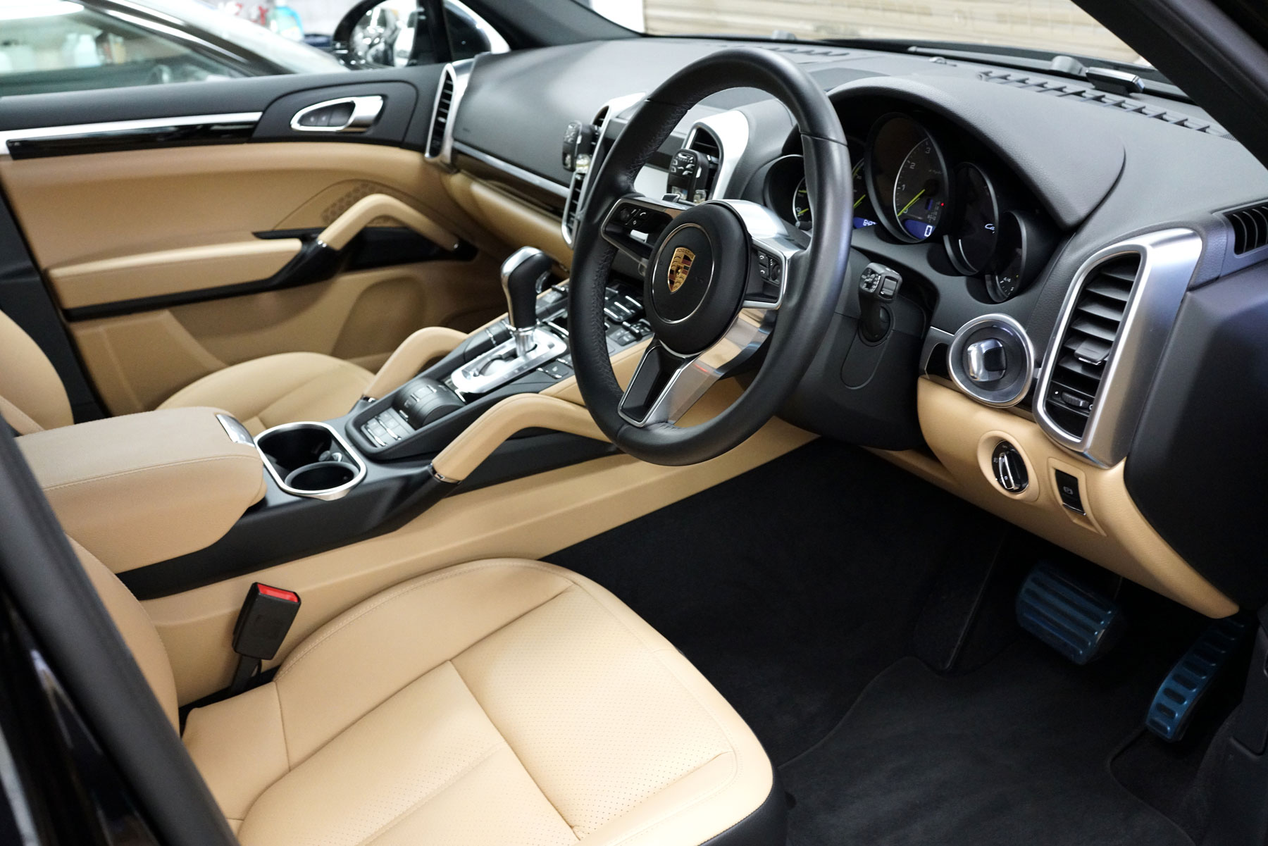 買取りしたポルシェ カイエンS Eハイブリッド ティプトロニックSが入庫いたしました。ディーラー車、右ハンドルでルクソールベージュ本革シートに911ターボデザイン21インチアルミホイールなどのオプションを装着しています。
