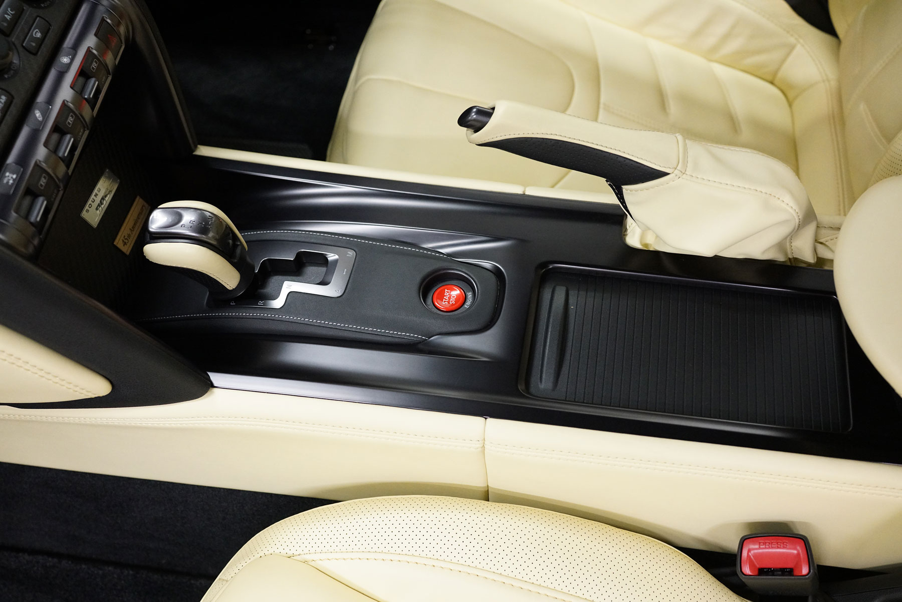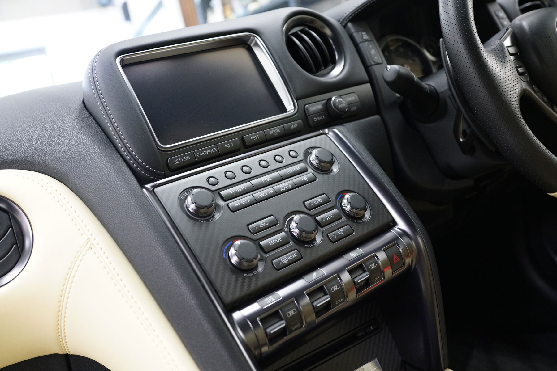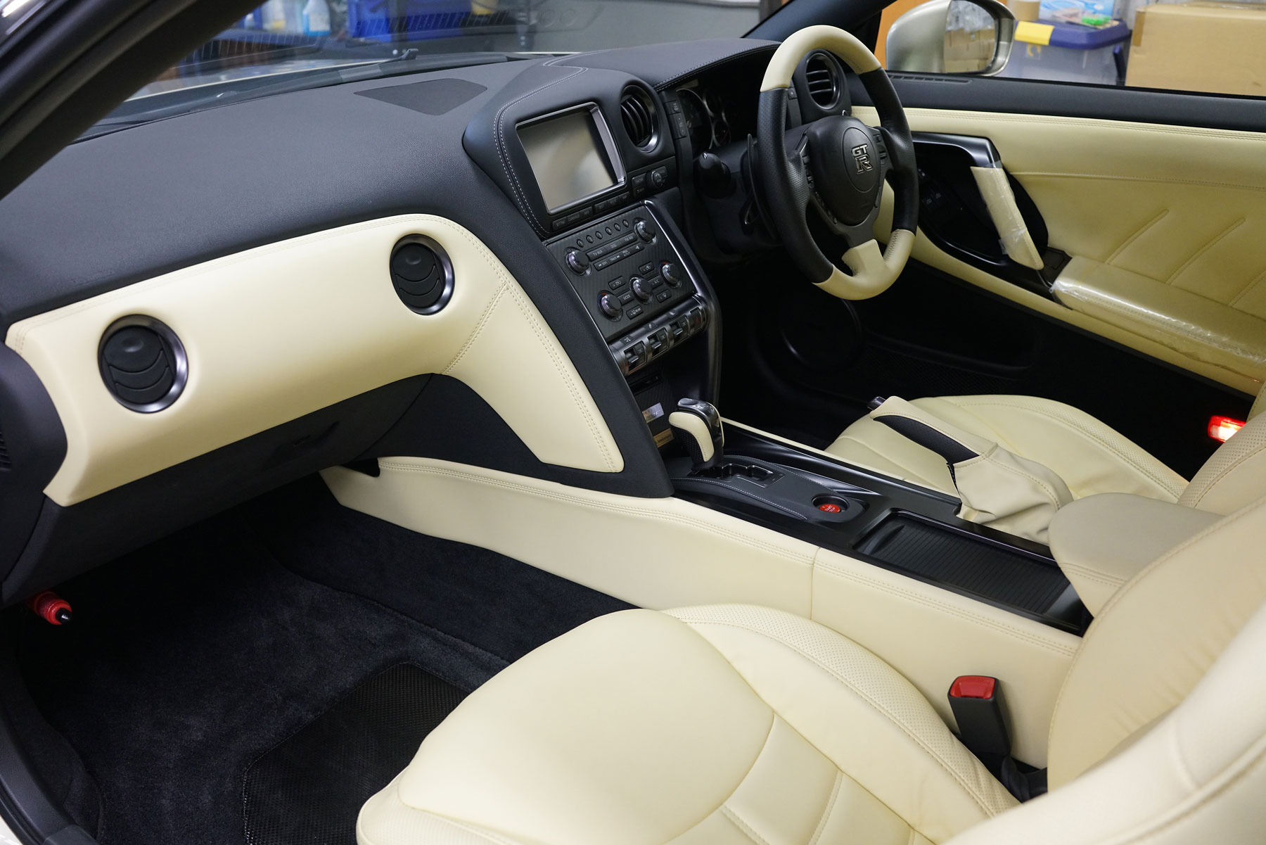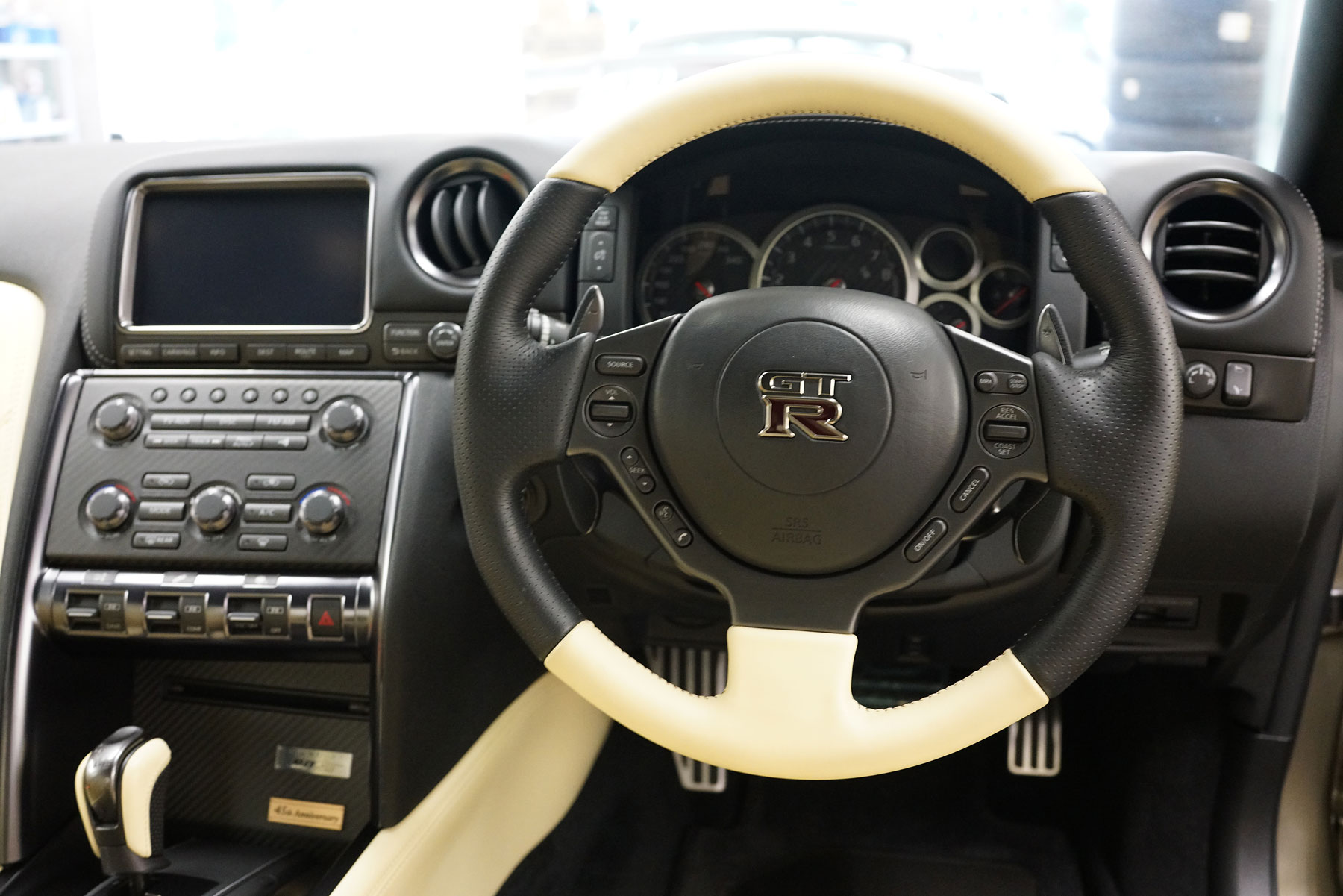 買取りしたR35GT-R 45周年記念車が入庫いたしました。ワンオーナー、ガレージ保管、禁煙車で、ファッショナブルインテリア(アイボリー)、BOSEサウンドシステム、サッチャム防盗システム、プレミアムスポーツフロアマットを装備しています。内外装ともに上質でサーキット未走行の45台限定車です。