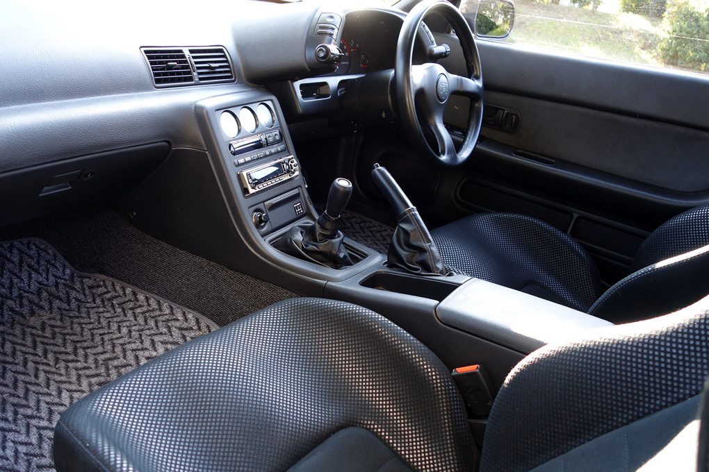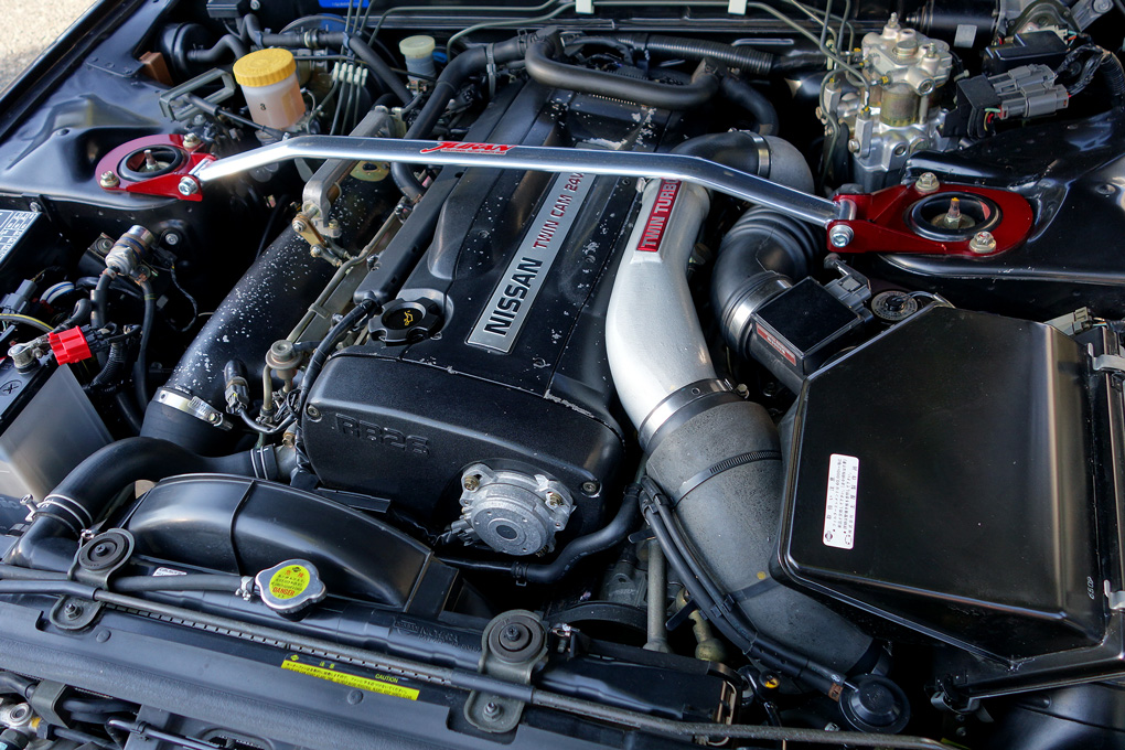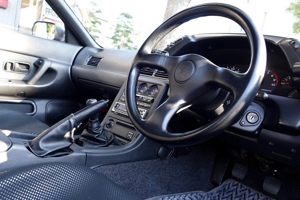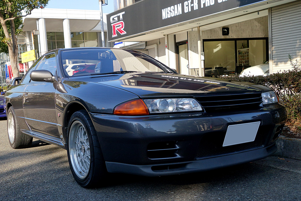 後期型のR32GT-Rが入庫いたしました。フロントシートとフロントブレーキキャリパーをBNR34用に換装し、BBS17インチアルミホイール、HKSマフラー、NISMOシフトノブ、ETCを装着しています。内装外装ともに上質な状態を保っており、禁煙車です。