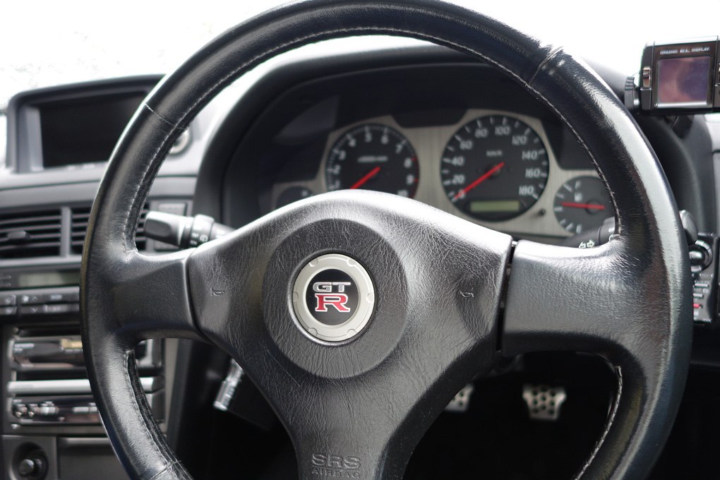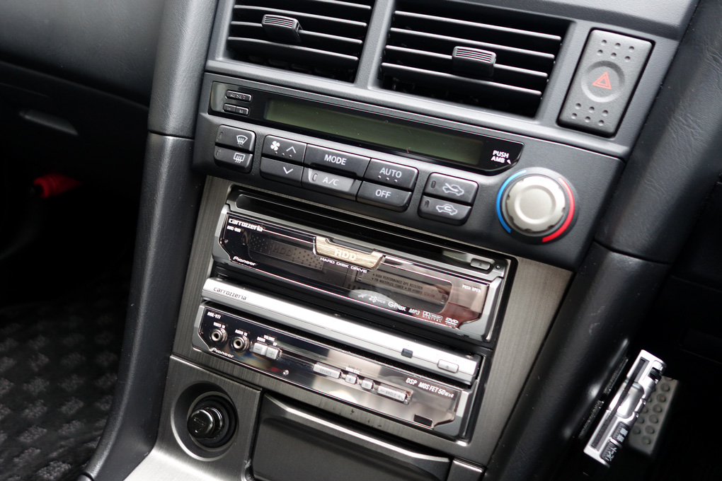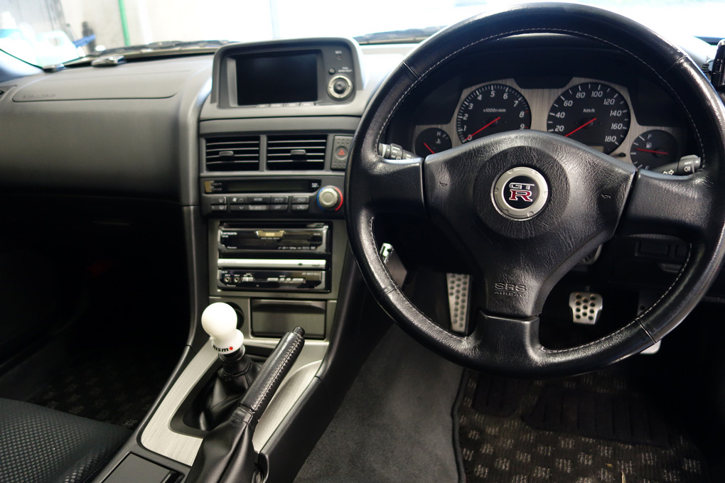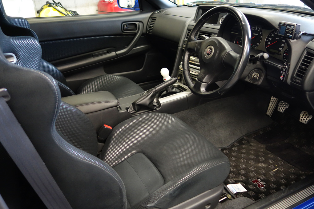 神奈川県で買取りしたR34GT-R STDモデルの後期型が入庫いたしました。ワンオーナー、ガレージ保管、Pガラス、VスペックⅡ用フロントディフューザー付でHKSマフラー以外はノーマルになり、内装はHDDナビとETC、GPSレーダー探知機、NISMOシフトノブが装着されています。故障の多いMFDの液晶を新品に交換して納車いたします。車検は昨年10月に取得したばかりで平成28年10月まで残っています。定期的に日産ディーラーにて点検整備されていたお車です。
