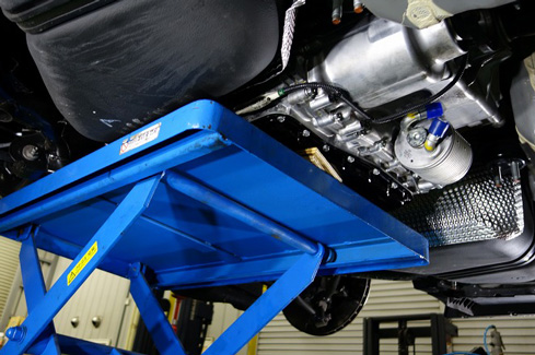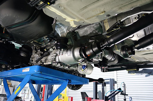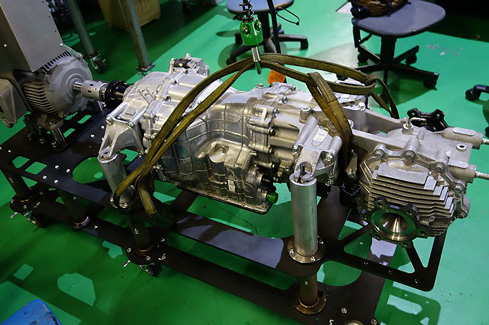 いよいよトランスミッションが見えてきました。トランスミッションはリヤのサスペンションメンバーごと車両から降ろします。そのため、ブレーキキャリパー、ショックアブソーバーを切り離します。さらにトランスミッションに繋がっている配線カプラーや、水冷式オイルクーラーの水配管も切り離す必要があります。水配管の切り離しには、このような専用の治具を使って外すのですが、さながら人間の手術のようですね。さらにプロペラシャフトの接続も切り離し、いよいよトランスミッションを車両から降ろします。大変、重いユニットなのでこのような専用のリフトを使います。