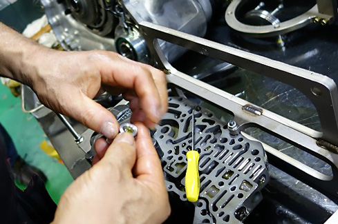 そこで、パッキンのゴムコーティングをカットします。じつは後期型のパッキンには既にゴムコーティング部分がありません。ちゃんと対策されているわけです。以上の作業と同時に、念のためオイルストレーナーも洗浄しておきます。続いて、油圧を少し高めにするためリリーフバルブのスプリングにシムを追加してセット荷重を変更します。油圧を高めにすることで、仮に将来エンジンチューニングを行なってもクラッチが滑りにくくなります。また、エンジンチューニングを行なわない場合でも変速レスポンスが向上するメニューです。いずれにしても、ミッションを分解したので同時にこれらのメニューも投入しているのです。それぞれの作業が終了したら、組立てて完了です。ここでも専用の治具が活躍しています。
