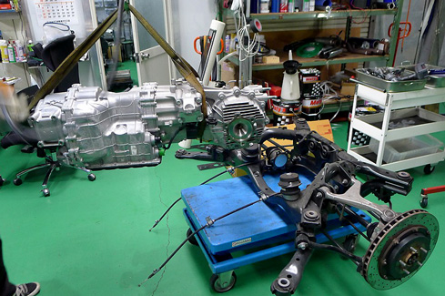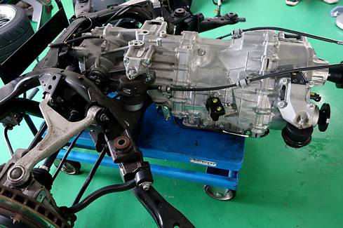 トランスミッションはこのようにサスペンションメンバーごと車両から降ろします。車両側はこのようになります。今回、トランスミッション対策を行なった車両は走行距離も浅く、新車のような状態でした。さぁ、いよいよトランスミッションをサスペンションメンバーから外します。サイドブレーキワイヤーやドライブシャフトなどを切り離し、トランスミッション単体の切り離しに成功。ココで、トランスミッションに専用の治具を取り付けます。というのも、トランスミッションの分解作業はこのように立ててする必要があるのです。さながらアンコウの解体のようです。準備ができ、いよいよトランスミッション本体の分解作業に入ります。