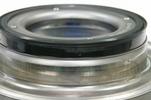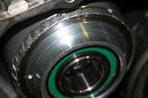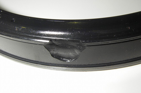 ではなぜ、オイルシールが破損してしまうのでしょうか。トラブルを起こしたクラッチをベンチテスト上で動かしてみると写真のように斜めに動いていることがわかりました。実際、トラブルを起こしたクラッチのオイルシールには写真のように斜めに当っていた痕跡が残っていました。