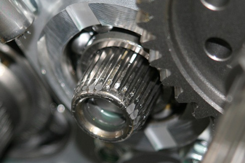 R35GT-Rのミッショントラブルの中では、よく知られたトラブルでしょう。とくにチューニングした車両やサーキット走行、ゼロヨンなど、ハードな走行をしなくても遭遇するトラブルなのです。本当に、普通に使っているだけで、車庫入れなどの際などにも発生することがあるのでタチの悪いトラブルと言えましょう。症状としてはミッションから突然「ガラガラ」と音が出ます。音が出たらスグに走行を中止すれば軽傷で済みますが、車庫入れを続行したりディーラーまで走行したりすると致命的な損傷に発展するケースが多いトラブルです。原因は、アウトプットシャフトのドライブギヤを固定しているCリング溝が破損してしまうからです。このため、ドライブギヤがシャフト上で不安定になりガラガラ音が発生します。最悪の場合はドライブギヤがケース内で大暴れし、クラッチやE-TSユニット、センサー類などを破損させてしまうのです。こうなると修復は諦めざるを得ません。