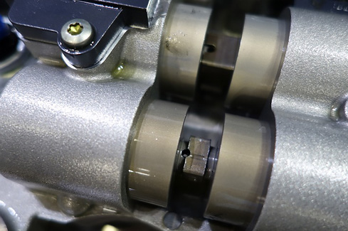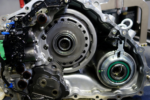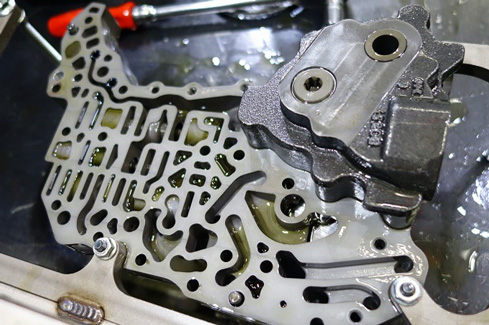 4つの円筒形の部品が油圧ソレノイドです。ひとつづつの円筒形の真ん中にある切欠きが、ギヤ側にあるシフトフォークに咬み込むことでシフト操作を行なっています。R35GT-Rは、ATで走っていると、街中でもあっと言う間に6速までシフトしてしまいます。走行条件によって、かなりこまめにシフトしています。むしろサーキット走行など全開で走っている時の方が各ギヤでレッドゾーンまで引っ張りますから、シフト操作の頻度は低いかもしれません。