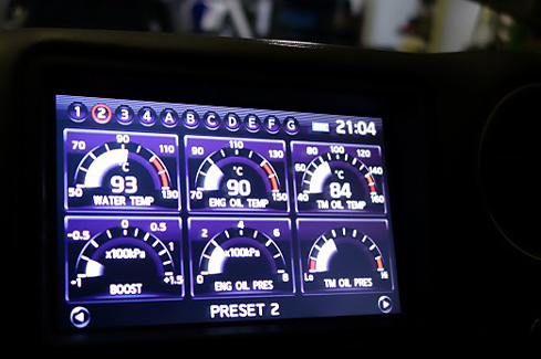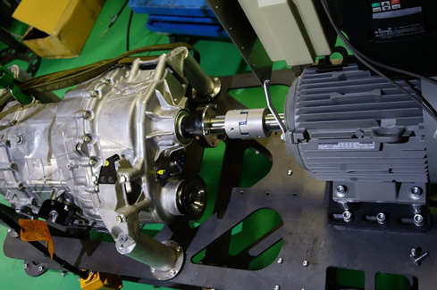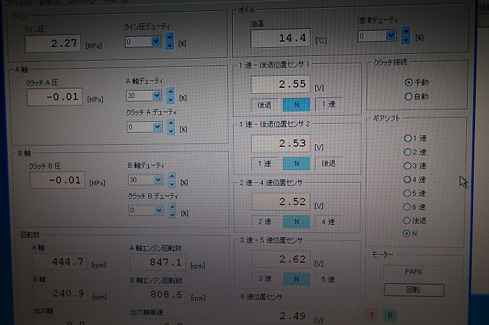 組み立てたトランスミッションは、ミッションオイルを入れて車載前に専用のテストベンチで動作チェックを行ないます。このテストベンチは当社のメンテナンスパートナーであるネココーポレーションが独自に開発したテストベンチです。このシステムが無いと、実際に車載して動作チェックを行なうしかありませんが、車載後に不具合が確認された場合は、再びトランスミッションを降ろして分解しなければなりません。テストベンチを使うことで、車載前に各部のチェックができるのです。このテストベンチは、車載状態と同様の条件とすることで、確実な動さチェックが行なえるシステムです。パソコンの制御画面には各クラッチに作用する油圧、油温。各ギヤのセンサー出力電圧などを確認します。もちろん、この時点でオイル漏れなどのチェックも行なっています。