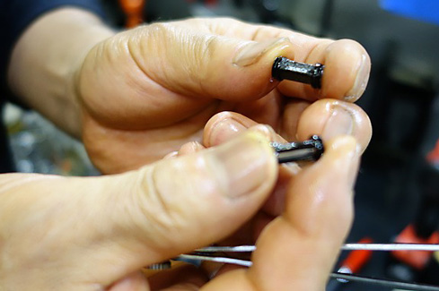 対策としてはシフトフォークと咬み込む部分の摩耗対策を行なうのですが、日産自動車から油圧ソレノイドの咬み込み部分を保護するためのスチール製クリップがリリースされているので、その対策品使っています。後期型ではこのクリップが装着されていますが、前期型でミッション対策を施していない車両では当然装着されていません。クリップが装着されていない車両については純正のクリップを装着。さらに鉄粉などが油圧ソレノイドに付着していた場合は分解しない方法で鉄粉を除去しています。