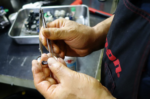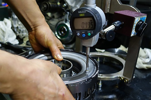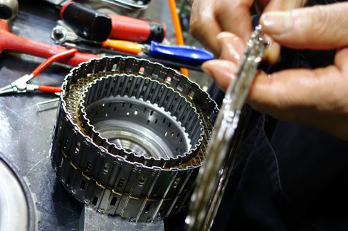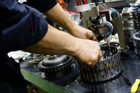 そこで対策としてストローク量が増えてしまったクラッチには、薄いシムを追加することで、本来のストローク量に戻してあげます。こうすることでピストンは正常な動きとなり、オイルシールの咬み込みの防止にもなるのです。実際の作業は、精密なストローク量の測定を行ない、クラッチディスクの摩耗状態も1枚1枚確認します。